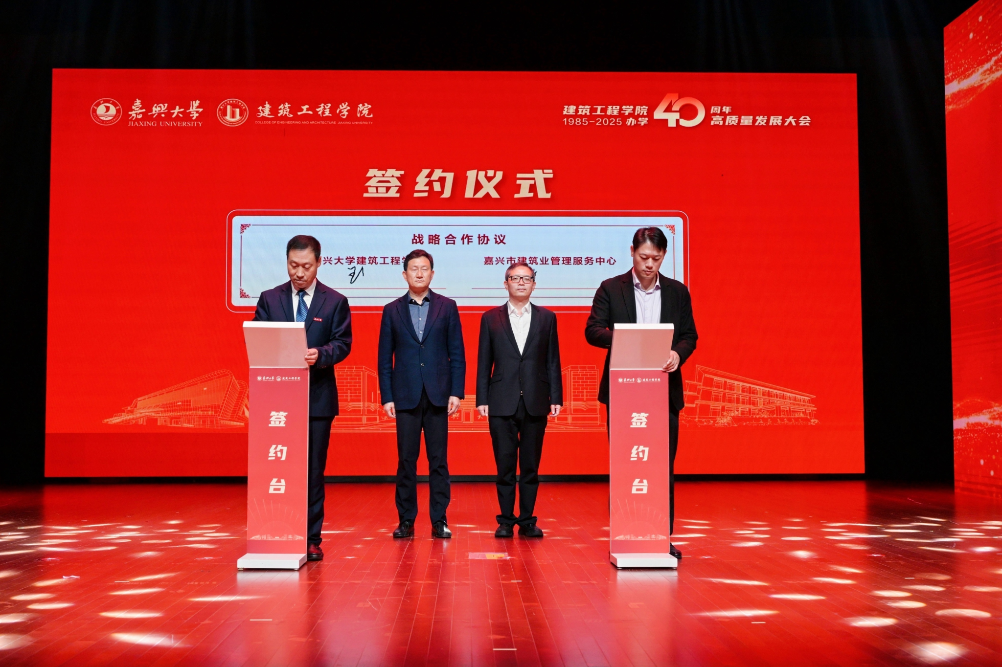 在304永利副校长周宏伟、嘉兴市住房和城乡建设局副局长朱斌的见证下,嘉兴市建筑业管理服务中心主任陈丽锋和永利3044院长王恩茂代表双方签订战略合作协议。