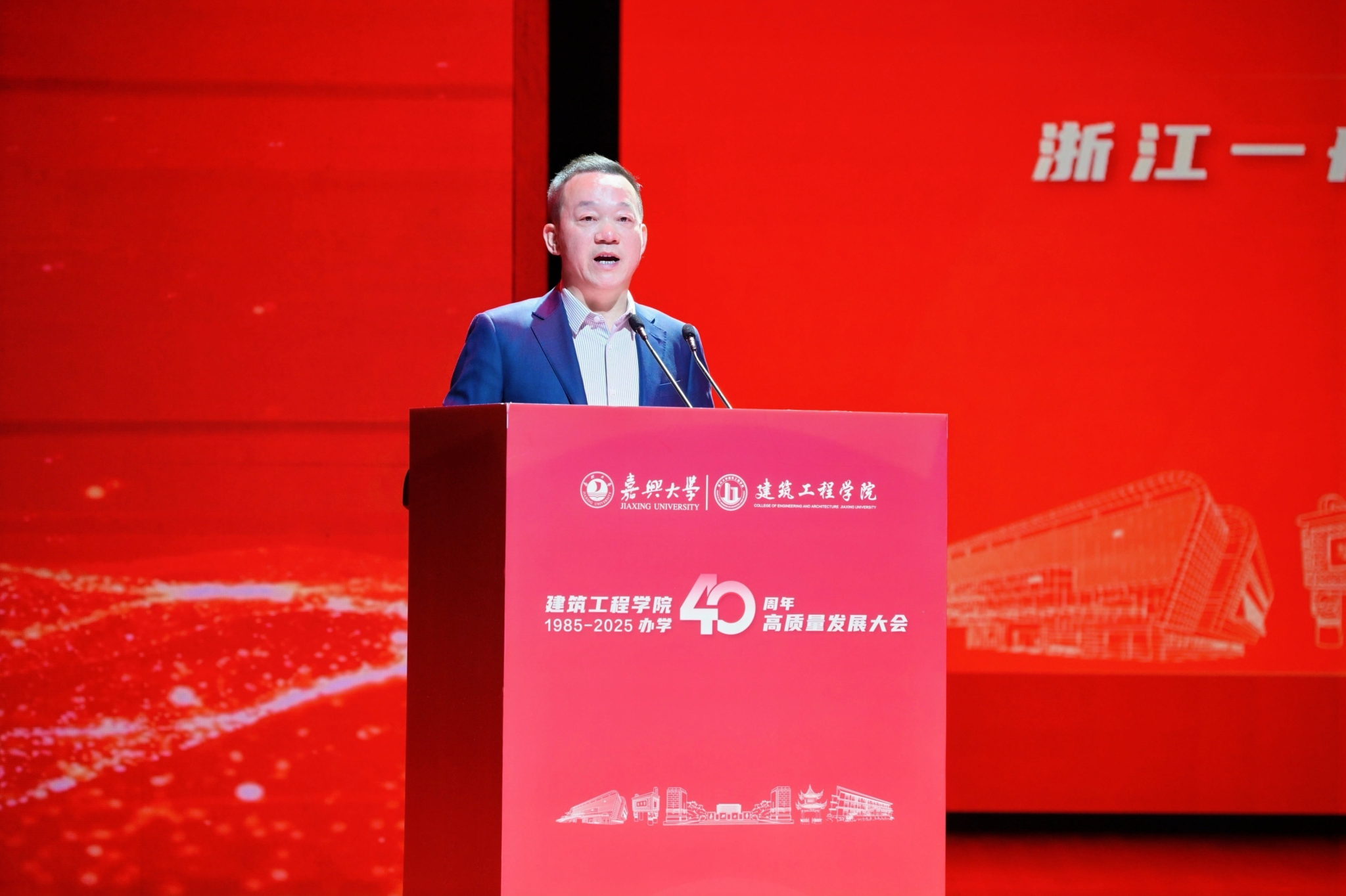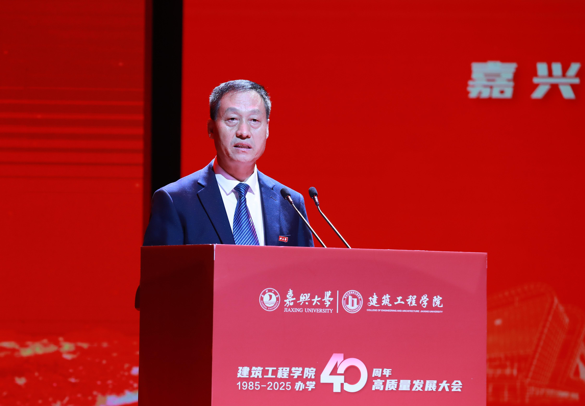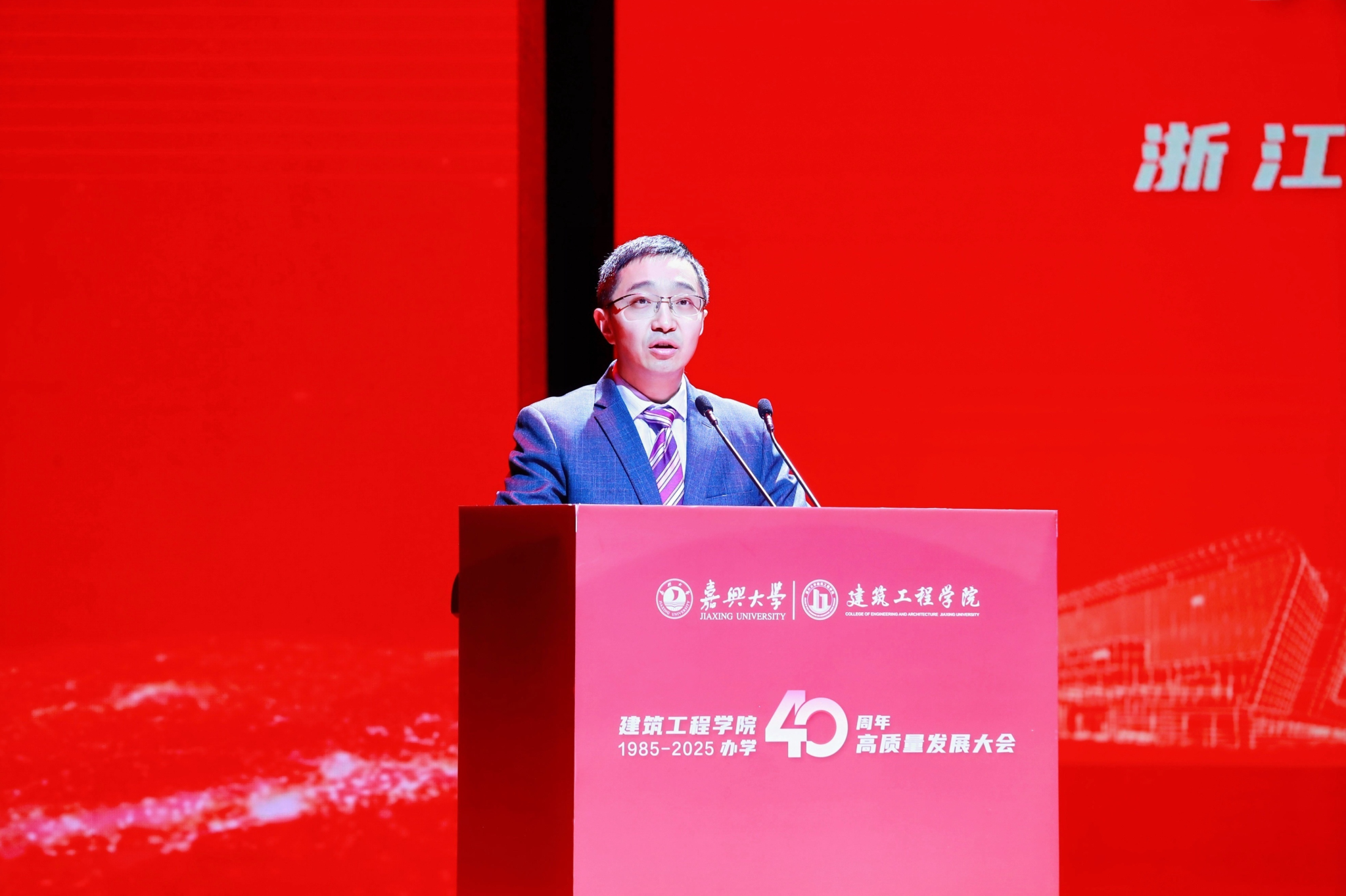 304永利党委书记沈希为大会致辞。他代表学校向长期以来关心和支持建筑工程学院建设与发展的各级领导、社会各界朋友、广大校友及辛勤耕耘在教育科研一线的全体教职员工致以敬意。他深情回顾,1985年,为满足地方经济建设对专业人才的迫切需求,原嘉兴高等专科学校土木工程系应运而生,自此踏上了服务嘉兴乃至全国城乡建设事业的征程。2000年,乘着高等教育管理体制改革的东风,嘉兴高专和浙江经专合并,土木工程系整合资源、凝聚力量,实现了从单一学科向多学科学院的历史性跨越,成为304永利服务经济社会发展的重要支柱。40年来,一代代建工人以服务国家建设需求为己任,以培育卓越工程人才为根本,在城乡建设、重大工程、产业升级等领域贡献智慧,用实干实绩诠释了“嘉大建工”的深厚底蕴与时代价值。