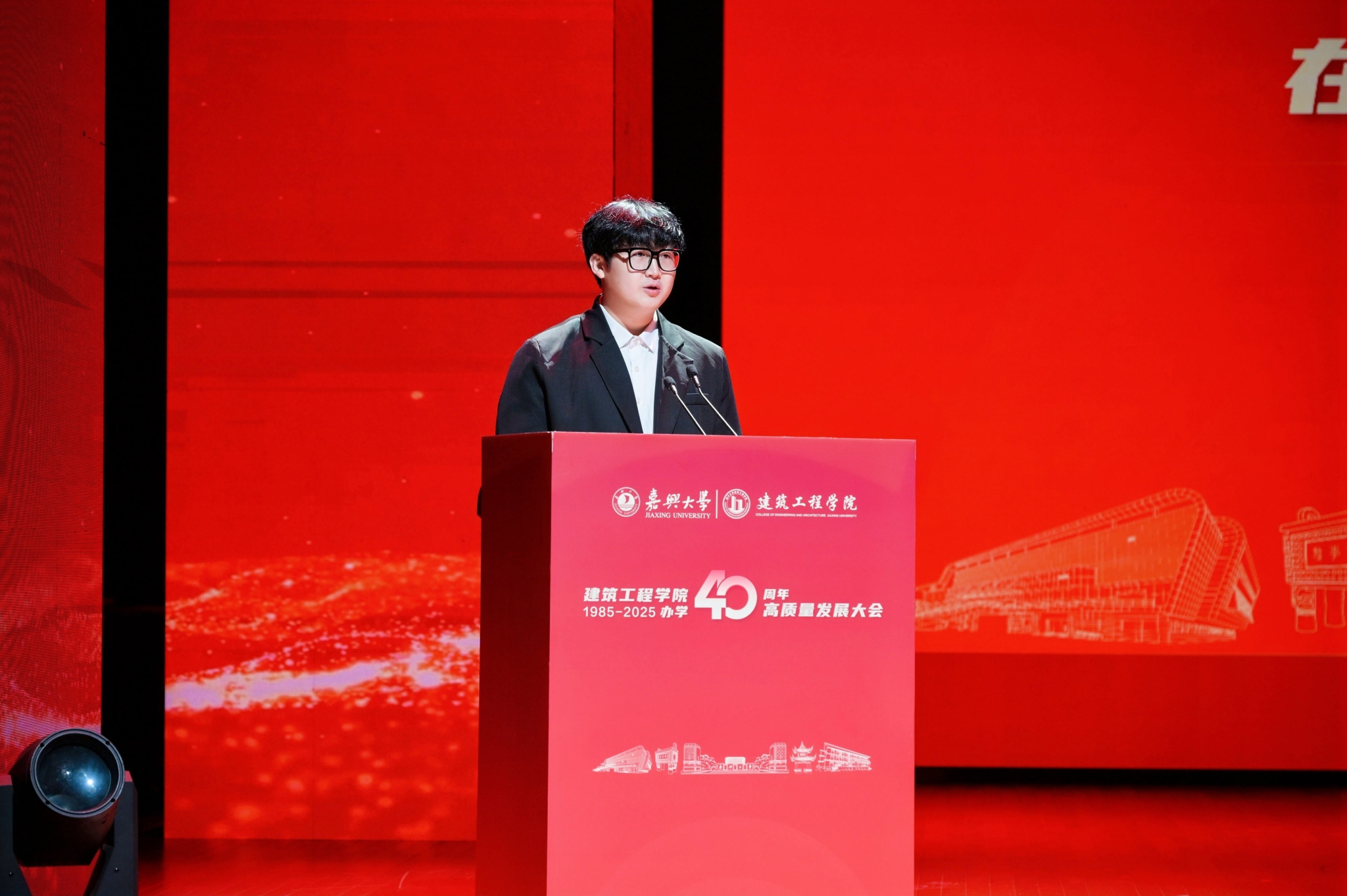 在校学生代表、工程管理专业222班的鄂鹏举发言中表示,有学院的文化与精神相伴,有校友前辈们的榜样,未来将以更坚定的脚步追逐梦想,在青春里延续新的光彩。