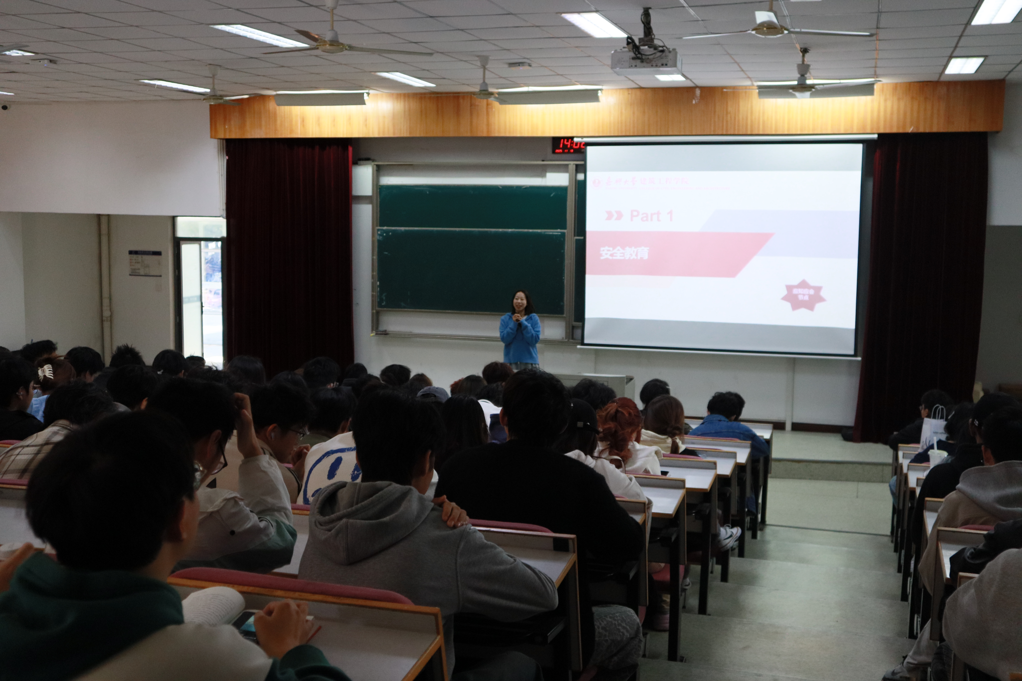 为营造安全有序的校园环境,徐静老师重点就强化电动自行车使用与寝室安全管理,为同学们做了详细介绍。她强调全体同学须严格遵守电动车相关规定,停放须整齐有序,不得占用疏散通道或影响正常通行。充电务必使用学校配备的专用充电设施,严禁私拉乱接电线充电、室内充电等危险行为。在寝室安全方面,徐老师强调,务必严格遵守寝室安全规定,严禁私拉乱接电线,杜绝使用违规大功率电器等。养成安全用电习惯,做到人走断电,共同守护温馨、安全的寝室环境。此外,徐老师还详细介绍了学校、学院关于就业与考研的相关政策。就业方面,提供精准的岗位推荐、就业指导服务及政策支持,帮助毕业生明晰职业方向,提升就业竞争力;考研方面,优化考研辅导资源,解读招生政策,为考研学子提供全方位的信息支持与备考指导,为毕业生升学深造保驾护航。