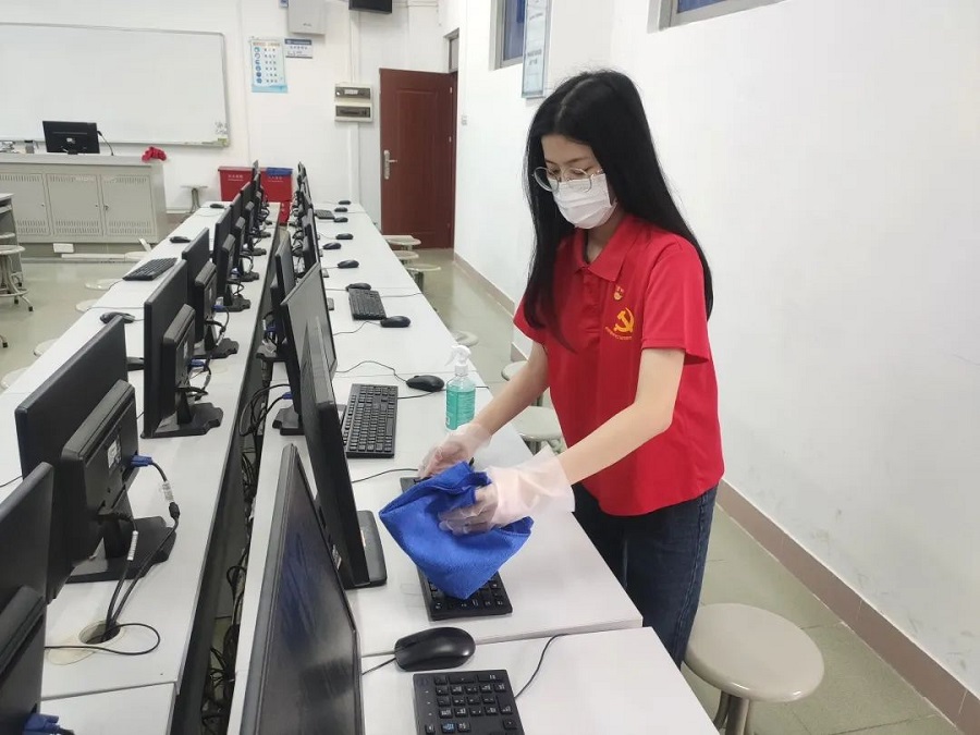 在活动过程中,党员同志们把为课室消毒清洁作为切入点,仔细地用酒精喷洒在抹布上给实训楼的电脑键盘、鼠标和桌面等这些高频触摸区域进行消毒,并清理课室垃圾,同时还不忘给课室的每一个角落消毒,发扬党员同志们“不怕脏、不怕苦、不怕累,撸起袖子加油干”的志愿精神,将服务精神和服务意识贯彻到底,用实际行动给师生办好事,办实事,共同打造干净整洁的课室环境。