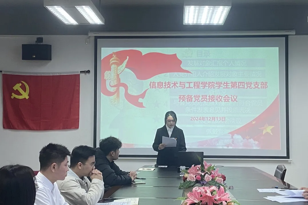 12月13日上午,信息技术与工程学院学生第四党支部在6教205召开接收预备党员支部大会。出席本次会议的有信息技术与工程学院学生第四党支部书记杨艳美和全体学生党员以及钱婉夏、赵文焯2名发展对象。本次会议由支部宣传委员钟晓艳主持。