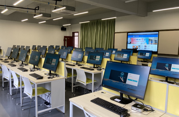 实训室相关配置主要有:泰山服务器(TaiShan 200 (Model 2280) ,128GB 内存,2 块600G SAS,8 块 4TB SATA,4*GE,2*10GE 光口(含模块)6 / 8.5 51.00)6台;超融合服务器(CPU:2*10core*2.2 GHz,内存:128GB DDR4 RAM(GB),系统盘:2*600G SAS,缓存盘:1.6TB NVMe,数据盘:8*4T SATA)6台;万兆以太网交换机2台;瘦客户端51台;华为交互智能平板1台。