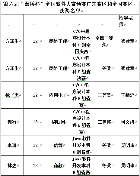 2015年5月31日,历时七个月的第六届蓝桥杯全国软件和信息技术专业人才大赛在北京大学收官。第六届蓝桥杯大赛由教育部高校学生司指导,工业和信息化部人才交流中心和教育部全国高等学校学生信息咨询与就业指导中心主办。我校有39位学子参加了广东赛区预赛,最终在广东赛区中荣获“C/C++程序设计大学组省赛”一等奖一名,二等奖两名,三等奖三名,在“JAVA 软件开发大学组省赛”中获二等奖2名,三等奖8名。并且我校信息学院学生方泽生同学在梁建军和王新忠等导师组的指导下,获得广东省赛区一等奖并入围全国总决赛,最终获得全国三等奖的佳绩。