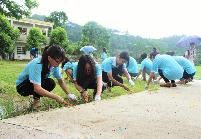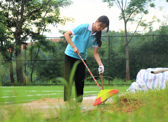 下午17点整,支教课堂结束,谭小龙老师便带领全体志愿者做务农的准备,志愿者们携带着队长李起勃同学分发的手套和小镰刀,向长满杂草的草坪中走去。也许志愿者们的动作不是那么熟练,但是志愿者们之间相互鼓励,很快志愿者们便全情投入到除草工作当中。虽然有手套的保护,但是草生长得杂乱无章且有的叶片很锋利,就免不了划伤志愿者们的手,这然而并没有阻挡志愿者们清理杂草的脚步。近一个小时的劳碌的务农活动中,虽然天气晴雨不定,有一段时间甚至下起了大雨,但雨停后,志愿者们又重新拿起了小镰刀清理杂草。除草活动完毕后,志愿者们都大汗淋漓,但看着那变得开阔的校园场地和堆在一旁的杂草,志愿们内心的满足和自豪不言而喻。纵使服务队除草务农的时间较为短暂,可这也是为桃源小学的美丽贡献自己的一份力量,更让志愿者们体会到劳动者的艰辛。
