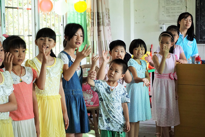 上午9点30分,为丰富孩子们的课余活动,后勤组精心准备了此次趣味运动会。受下雨天气的影响,运动会转移到室内进行,志愿者们用气球、彩带布置教室,为孩子们营造一个欢乐愉快的环境。孩子们被分为两组进行游戏,其中,运动会分五个游戏环节:小勺运球接力赛,快速反应,叠纸板,摸石头过河和抢凳子。在得知游戏规则后,孩子们都争先恐后地想要参加游戏,课室内一片欢声笑语。每一个孩子都尽情地投入游戏中,当自己组在游戏环节获胜时会抱在一起开心大笑,虽然输了的孩子们会在脸上流露出小小的失望,但在下一个游戏开始时,孩子们脸上又会浮现惊喜和期待的神情,仿佛这次是必胜的样子。游戏过程中,志愿者们不断叮嘱孩子们要注意安全,以防孩子们在游戏的过程中受伤。在此次趣味运动会中,小老师们有目的地通过游戏这一方式来培养孩子们的竞争意识和团结协作能力。