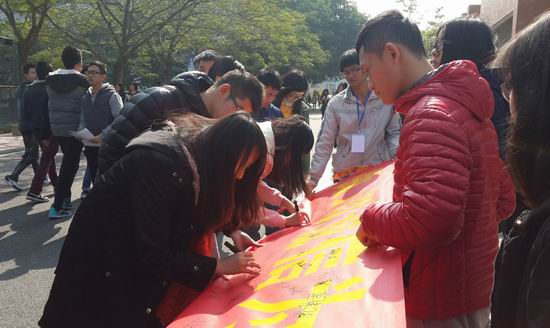 同学们在横幅上签下自己的名字