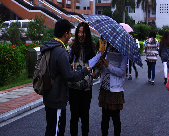 天公不作美,正当宣传的初始之时,天空便开始飘起了细雨,但冷咧的寒风冻雨并不能磨灭干部干事们的宣传热情。校道上,穿着明黄色工作服的干部干事们面带笑容,积极详细地回答对本次活动感兴趣的同学的问题,并对汉字输写大会的形式作出了系统性介绍。在整个宣传的过程中,明亮的黄色身影穿梭在校园的每一块领域,将计算机系团委的工作激情和热情渲染了整个宣传现场。