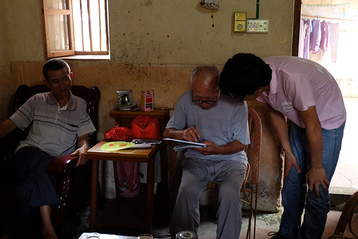 与此同时,调研组为提高关于客家古屋建筑调研工作的程度,他们以分发调查问卷和访谈的形式进行调研。队员们在了解到梅州是围龙屋分布最多的地区,且因围龙屋建得早、年代久远,作为梅州历史的重要见证,具有不可替代的历史价值等资料的基础之上,不断地与当地村民进行深入访谈。其中遇到一位博学多广的老爷爷,其对围龙屋这些古建筑有独特的见解,与队员们热情地讲解了许多,从围龙屋的作用到其历史、结构,老人渊博的学识让队员们赞叹不已,同时也给调研工作提供了重要的参考信息。