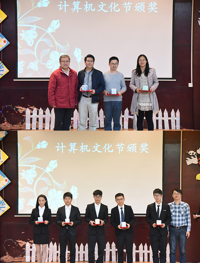 精彩的开场舞蹈表演后,晚会正式开始,贺浪萍处长为晚会致辞,其为信息学院全体师生带来24字符祝福:“文化节节节攀升!冬至节节节团圆!元旦节节节雄唱!”,贺处长期待信息学院未来在计算机领域的办学中不断进步、为校增光,其也祝愿广大师生工作顺利、学习进步。接着吴广裕副院长宣读第六届计算机文化节表彰决定,其指出在学校领导的关怀与老师的精心指导下,信息学院学生在2016年奋力拼搏、积极创新,在全国与省部级各类学科竞赛、课内外学术创新活动中表现突出,获得全国性奖项5项、省级奖项33项,为推动学院学科竞赛和创新教育开展,特此对优秀团队和个人进行嘉奖,希望广大师生以之为榜样。贺浪萍处长和周程副院长分别为何文海、胡允娥、王新忠等指导老师代表与黄铭琪等学生代表颁奖。