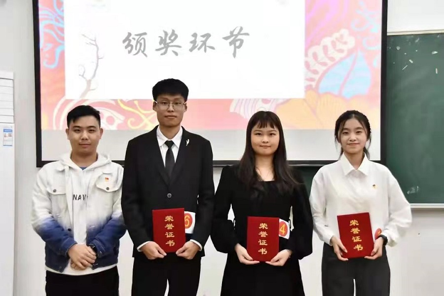比赛伊始,主持人宣布比赛环节及计分规则,让在场的参赛选手及评委观众明晰了相关评比规则。在第一环节的“模拟主持”中,六名选手按出场顺序抽取题目,并依次上台进行自我介绍。场上,每位选手沉着冷静,充分展示出了主持应有的基本功底。随后,第二环节的“连词成段”里,选手们现场随机抽取带有三至五个关键词的卡片。经过短暂的准备时间后,六名选手运用自身丰富的知识储备以及引用当今时事,给在场师生带来了一段独具特色的演讲。工作人员统计分数期间,e行动-志愿服务队曲艺队为师生们带来了动听的歌曲表演。最后,比赛的最终结果公示。六号选手朱伟茏凭借出色的发挥获得了本次比赛的冠军,四号选手唐夏冰荣获亚军,一号选手陈桐迎荣获季军。