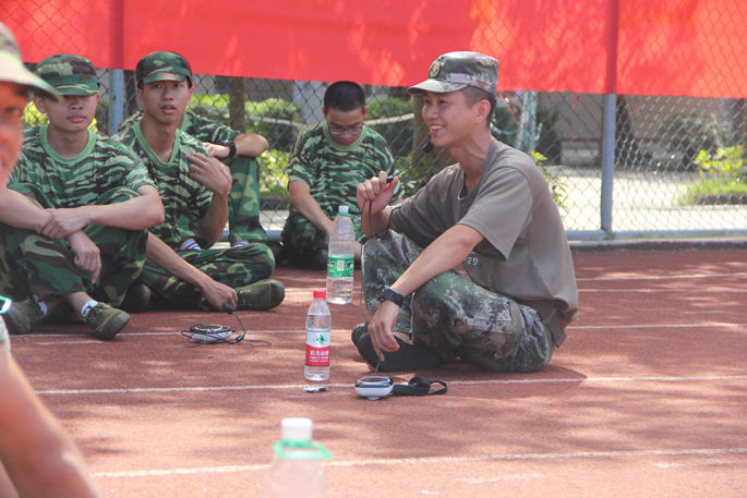 在休息之余,教官首先给同学们分享了其当兵时期的趣事,同学们全神贯注地听着,到精彩之处都不约而同地响起了赞许的掌声。教官以当初其在部队里艰苦训练,力争上游的亲身经历来告诫同学们要严于律己、积极进取,不要有丝毫的松懈才能够进步。接着教官便带领着同学们唱军歌,嘹亮的歌声响彻整个训练场,其间有几位同学勇敢地上前为大家献唱,下面的同学们为歌声所感染,也附和地唱着。休息过后,新生们又投入了训练当中,女生方队的新生走着坚定的齐步,训练场上响起其嘹亮的口号;男生方队方面在教官的带领下练习军体拳,同学们身姿挺拔,气势十足。