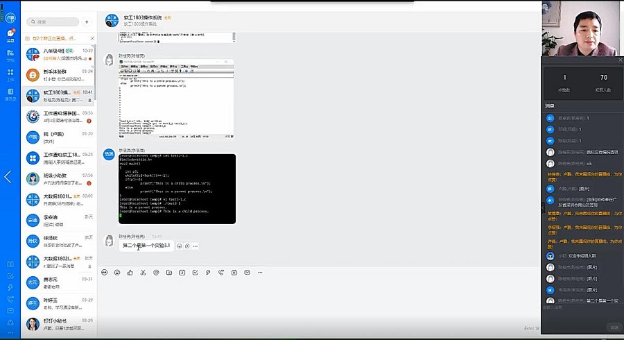 本次公开课采用钉钉和超星学习通两个在线教学平台相结合的方式,讲授了一堂操作系统实验课。教学组织过程按照实验任务布置、主要知识点讲解、教师演示、学生操作、教师检查、思考与讨论等几个环节进行。师生交互主要通过钉钉签到、教师提问、在群内回复以及学生疑点及实验操作结果截图,教师即时反馈的方式进行。教学现场气氛热烈,互动频频,达到了学生跟得上、学得会、做得出、理解透的教学效果。利用超星平台,卢鹏还将课后作业的布置,教学资料整理及课程视频回放上传至学习通教学平台方便学生课后学习。