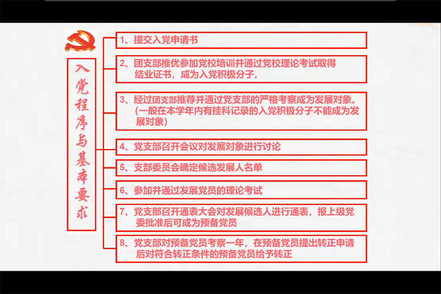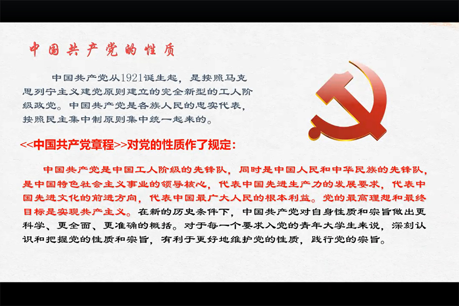 会议伊始,丁秀对中国共产党的性质与党的章程做出解释,对党的发展历程与奋斗目标进行了详细的介绍,并通过此次抗击新冠疫情中多件党员英雄事例,阐述了中国共产党在国家建设发展过程中所发挥出的带头引领作用。随后,丁秀勉励同学们要从党的性质与宗旨、党的路线与纲领、党的指导思想与奋斗目标三大方向出发,端正与明确入党动机。接着,丁秀向同学们介绍了广州商学院信息技术与工程学院党支部的发展现状、在学院日常发展与建设中所起到的先锋模范作用与获得的各项成就。在会议最后,丁秀还详细介绍了学校入党程序与入党基本要求,并就同学们在申请入党的过程中经常提出的问题进行解答。