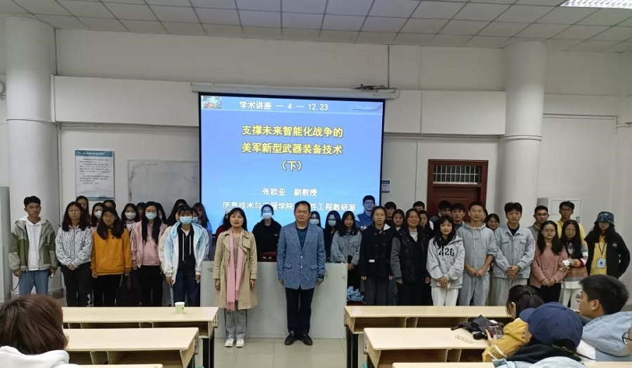 讲座伊始,张欧亚博士向师生们介绍了美军无人系统技术项目设置的概况和背景,美军在探索的几种新的智能化作战概念,使师生们对于未来多种智能化作战方式有了初步了解。随后,他讲解了集群(蜂群)式作战的概念、技术灵感、作战优势、蜂群的4种指挥控制模式(集中式控制协调、分层控制协调、共识性协调、应急协调);结合“谁在指挥鸟群在飞”的仿真实验,讲解了低智能生物群体通过一些简单的协作规约也可以实现“1+1﹥2”的系统涌现效应;他还分别介绍了美军正在开展的蜂群作战相关的几个技术支撑项目,包括“山鹑”无人机蜂群、低成本无人机蜂群技术、进攻性蜂群战术等项目,还介绍了反微型无人机蜂群的拦截试验、美军与俄军无人机蜂群攻防对抗的实战案例,演示了几段视频。接着,张博士讲解了人机(有人机-无人机)整合作战编队的作战概念,指出无人机系统智能化和自主化程度将不断提高,自主控制等级划分为10级,当前小型无人机的发展重心聚焦于提高人-机编队能力;结合“忠诚僚机”项目,他讲解了F-35隐身战斗机飞行员用集成式头盔瞄具(包含脑控接口)等尖端科技,包括利用自动化智能化的计算,将来自不同传感器的关键信息融合,转化为飞行员使用的单一操作图,导航细节、来自光学传感器的瞄准数据、飞行高度和速度、敌方威胁的细节信息等,都被自动组织整合,让飞行员能迅速作出决策。继而,张欧亚博士讲解了航母载射的大型远程多用途无人机全自主作战、海上无人舰/潜艇(潜航器)攻防战等新型作战方式,以及连续创造了多个世界第一的X-47B验证机所用的人工智能等高新技术;还为师生们简单介绍了美军空天(临近空间)多用途无人战机、新一代智能化反舰巡航导弹——远程反舰导弹(LRASM)——人工智能技术在导弹武器精确制导中的最成功应用案例。张博士强调指出算法、软件、体系结构设计对人工智能等技术的重要性。最后,张欧亚博士总结发言。他认为,师生们除了学习民用本领域技术、当今流行技术,还应重视对未来智能化战争、国防高新科技和军民通用技术的学习,并呼吁师生们积极参与各项学术讲座、学术沙龙活动,拓宽自身的知识视野,提升自身综合素质,塑造爱国奉献、积极作为、健康向上、勇于创新的品格。