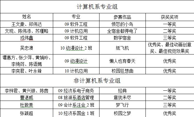 随着社会的发展,数码技术在不断提高,数字生活已经成为社会的主流,在此契机下计算机系团委响应党中央提出的“创先争优”的伟大号召,切合我院“一体两翼”的教学方针,以“转变学生学习方式”为目的,本着“为科技爱好者打造闪亮舞台”的宗旨,承办了此次科技学术超市之数字媒体设计大赛。在本次大赛决赛中获奖具体名单公示如下: