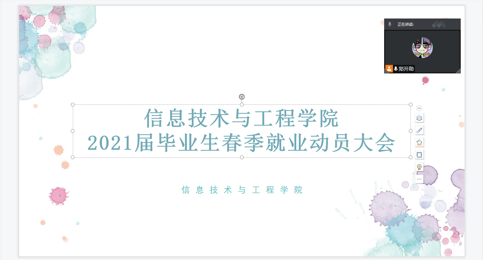 为深入推进我院2021届毕业生就业工作, 抓住当前毕业生就业工作的关键冲刺阶段,促进毕业生充分和高质量就业,确保如期完成2021届毕业生就业工作目标任务,信息技术与工程学院于5月8日晚上通过“钉钉”平台线上开展毕业生就业工作线上推进会。出席本次会议的有信息技术与工程学院院长姜灵敏、副院长吴广裕、党总支书记关俊明以及学院全体教师。会议由副院长吴广裕主持。