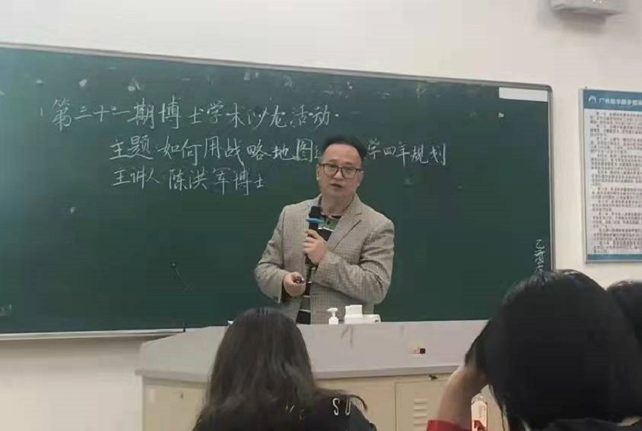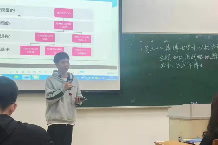 讲座伊始,物联网工程2101班学生代表上台展示自己的战略地图,并分享了对大学生活的规划与憧憬。随后,陈洪军博士对其战略地图规划进行了点评,同时也指出规划中存在的优缺点。他希望同学们能锻炼强健的体魄、发展良好的人际关系并做好清晰的大学规划,从而让大学生活充实而丰富多彩。紧接着,陈洪军博士向同学们介绍了平衡记分卡,并展示自身借助平衡记分卡制作的个人生涯发展规划。他提出,同学们要增长自身的知识技能,学会将长短期目标进行细化处理,制定适合自身的战略地图,实现个人目标和实践高度结合。