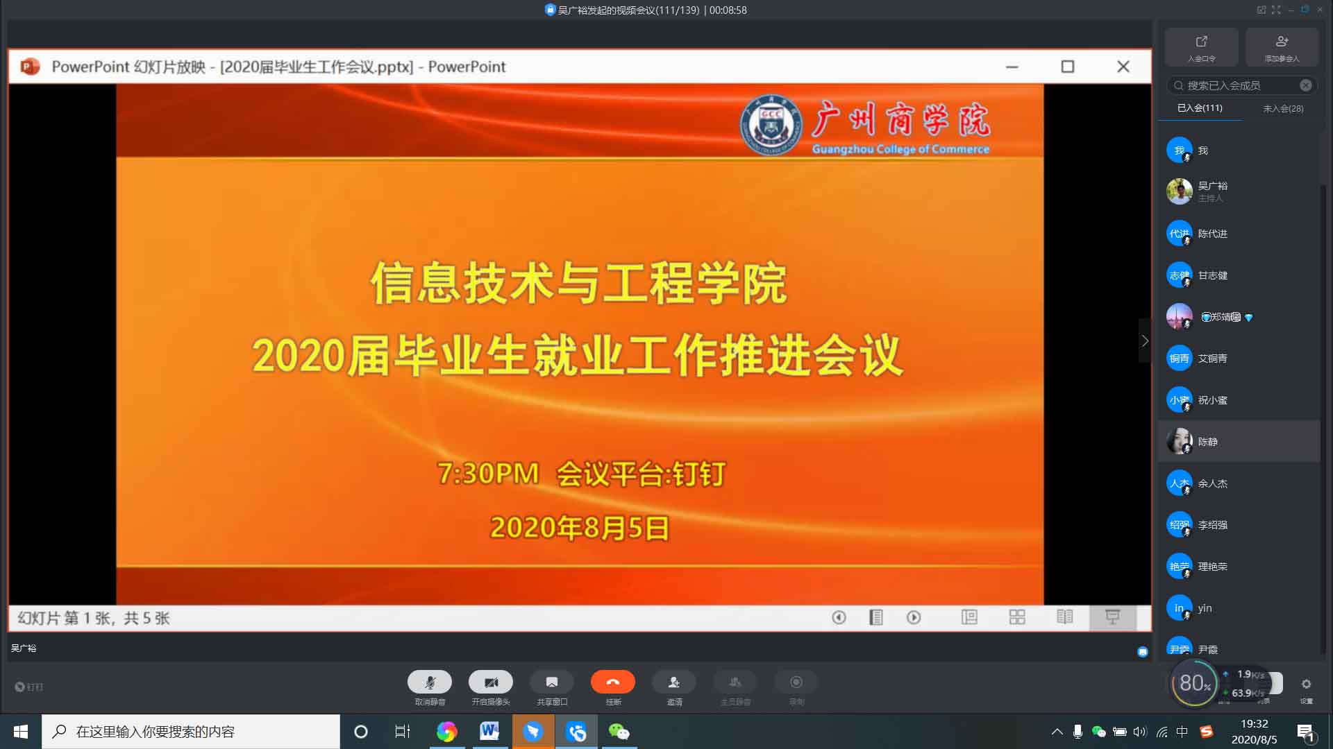 为深入推进我院2020届毕业生就业工作, 抓住当前毕业生就业工作的关键冲刺阶段,促进毕业生充分和高质量就业,确保如期完成2020届毕业生就业工作目标任务,信息技术与工程学院于8月5日晚上通过“钉钉”平台线上开展毕业生就业工作线上推进会,出席本次会议的嘉宾有信息技术与工程学院院长姜灵敏、副院长吴广裕、党总支书记关俊明以及学院全体教师。会议由副院长吴广裕主持。