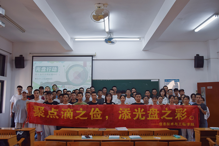 为积极响应“光盘行动”的号召,信息技术与工程学院开展了“光盘行动”系列活动。自2020年9月29日正式发布至今,获得了我院学子的积极响应,其中 600余人参与签字活动,13个班级进行班会活动,三大活动均取得了良好的宣传效果。