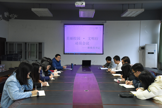 2017年3月7日中午在第六教学楼205召开动员会议。参加会议的有信息学院党总支林俊杰书记、团委书记王轻纱老师以及三大组织干部代表。会议上,林俊杰书记对“美丽校园·文明行”系列教育活动做出介绍,活动包括美丽校园志愿维护周活动、平安校园志愿维护月活动、爱心育苗植树节活动等校内外系列志愿活动,希望干部们积极落实活动。最后,王轻纱老师补充强调干部务必认真积极对待此项工作。
