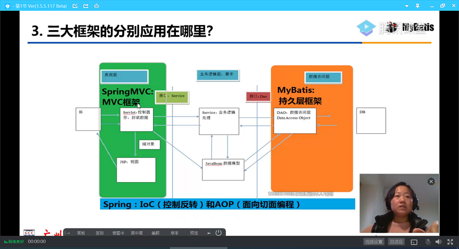 郑冬花老师的“Web架构应用开发”课程于当天第1节课在腾讯课题进行直播授课,主要内容是数据访问架构——myBatis。郑冬花从上次课内容回顾开始,从业务需求出发,引入本次课程的相关理论与实践技能的知识,灵活运用直播平台软件、PPT和开发环境IDE,通过理论讲解、操作演示和问题互动等环节详细解析了Web应用开发中数据访问架构myBatis的技术特点和使用方法等内容。