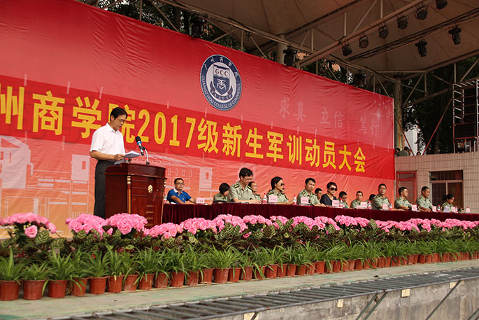 军训团团长陈甲对2017级新生的入学表示真挚的祝贺,其称广东省军区挑选出85名经验丰富的优秀士兵担任我校军训的教官,表示了对我校军训工作的高度重视。他相信这次军训会成为新生人生旅途中难以忘怀的一段经历,告诫同学们:“今天的你们没有虚度时光,明天的你们定会更加美好”。接着2017级国际学院刘振威同学代表军训新生对学校的领导、老师、教官致以崇高的敬意和衷心的感谢。他表达了新生对体验绿色军训生活的热切渴望,他相信,强劲体魄、坚韧的品格是担当大任的精神条件,并承诺将在军训期间振奋精神、昂扬斗志;在面对即将到来的骄阳与风雨,他坚定“流血流汗不流泪,掉皮掉肉不掉队”。