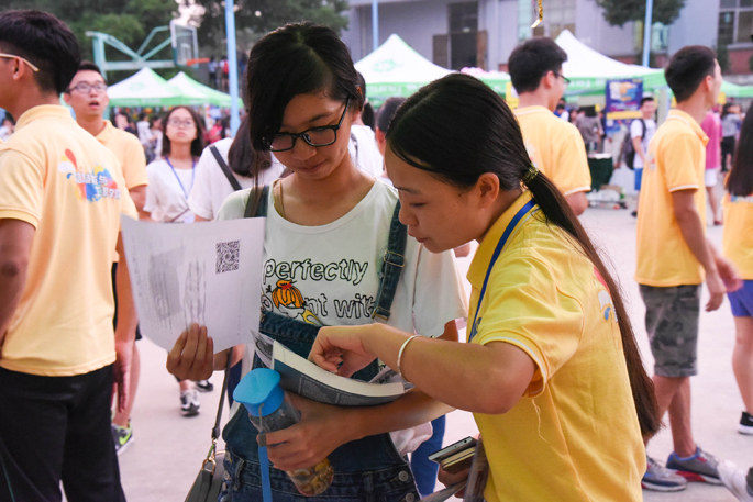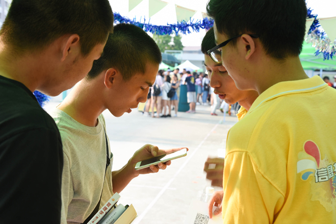 烈日当空,篮球场上人来人往,各个摊位工作人员各尽其能,招揽着新生同学们前去摊位了解社团组织。信息学院团委学生会也不甘示弱,一大群小黄人一齐呼喊:“信息学院团学欢迎你”,这样引起了来往同学的注意,即使不是信息学院的学生,也向小黄人招手问好;而信息学院新生听到宣传,也闻声而来,前来摊位了解。工作人员积极地向前来询问的新生介绍团委和学生会的部门工作职能以及特色活动,小黄人的热情接待使信院新生感到宾至如归,对团学有兴趣的同学也填写了报名表。
