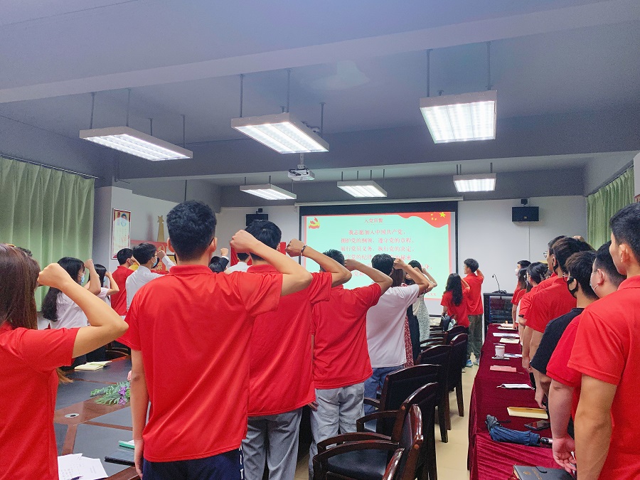 全体党员起立面对鲜红的党旗,高举右拳庄重宣读入党誓词,铮铮誓言是对党和人民作出的庄严承诺,是党员必须遵守的行为准则,同时也是党员们终身的追求。