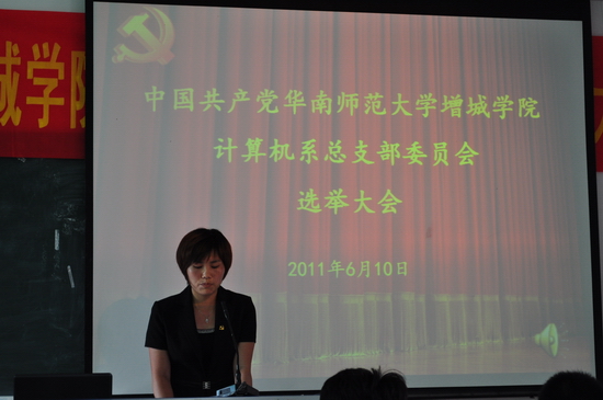 根据华增党委[2011]12号文《华南师范大学增城学院系党总支选举工作实施方案》的通知精神,按照《中国共产党基层组织选举工作暂行条例》(中发[1990]8号)的要求,增城学院计算机系党总支部委员会于2011年6月10日下午在教学楼B101召开了党总支部委员会选举大会。学院党委委员、副院长高惊生莅临大会指导,全系教职工党员和学生党员代表共108人参加了大会。大会由王轻纱同志主持。