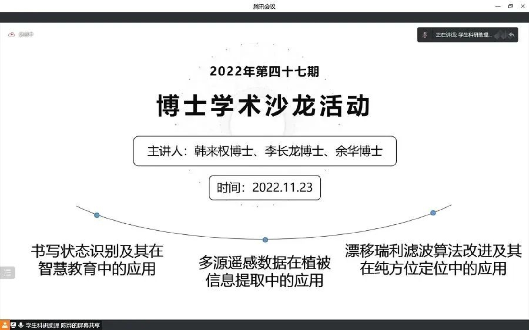 本次博士学术沙龙活动,三位博士分别报告了各自专业领域成果以及最新的研究兴趣与方向,并就书写状态识别、多源遥感数据和漂移瑞利滤波算法三个方面的内容同在会师生共同探讨,发表自身的理解与看法。学识在交流中增长,智慧在聆听中启迪。本次活动为在会师生提供了一个交流平台,从而培养在会学生对科研的兴趣,活跃学术氛围,促进师生共同进步。