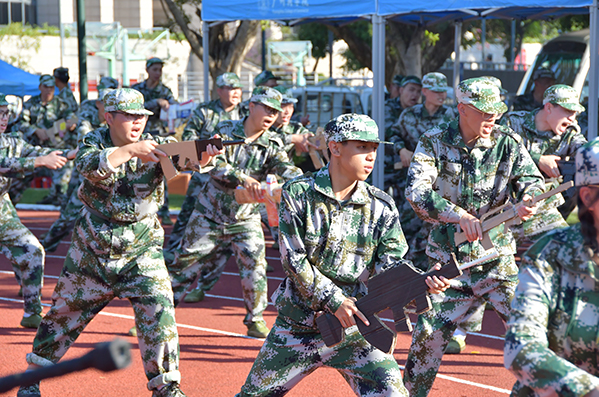 在教官“成刺杀操队伍散开”口令下,方阵在整齐、铿锵有力的正步声中由内而外迅速散开。“狭路相逢勇者胜,有我无敌,精忠报国……”,他们的声音在校园当中回荡。在教官带领下,新生们依次完成刺杀操各项动作,左砍右踢,如同军人般飒爽利落,展现强国有我的决心。操训练后,教官就此次训练进行总结,对每一个动作所存在的问题依次讲解,并对训练给予肯定,期望在接下来的训练有更大的进步。