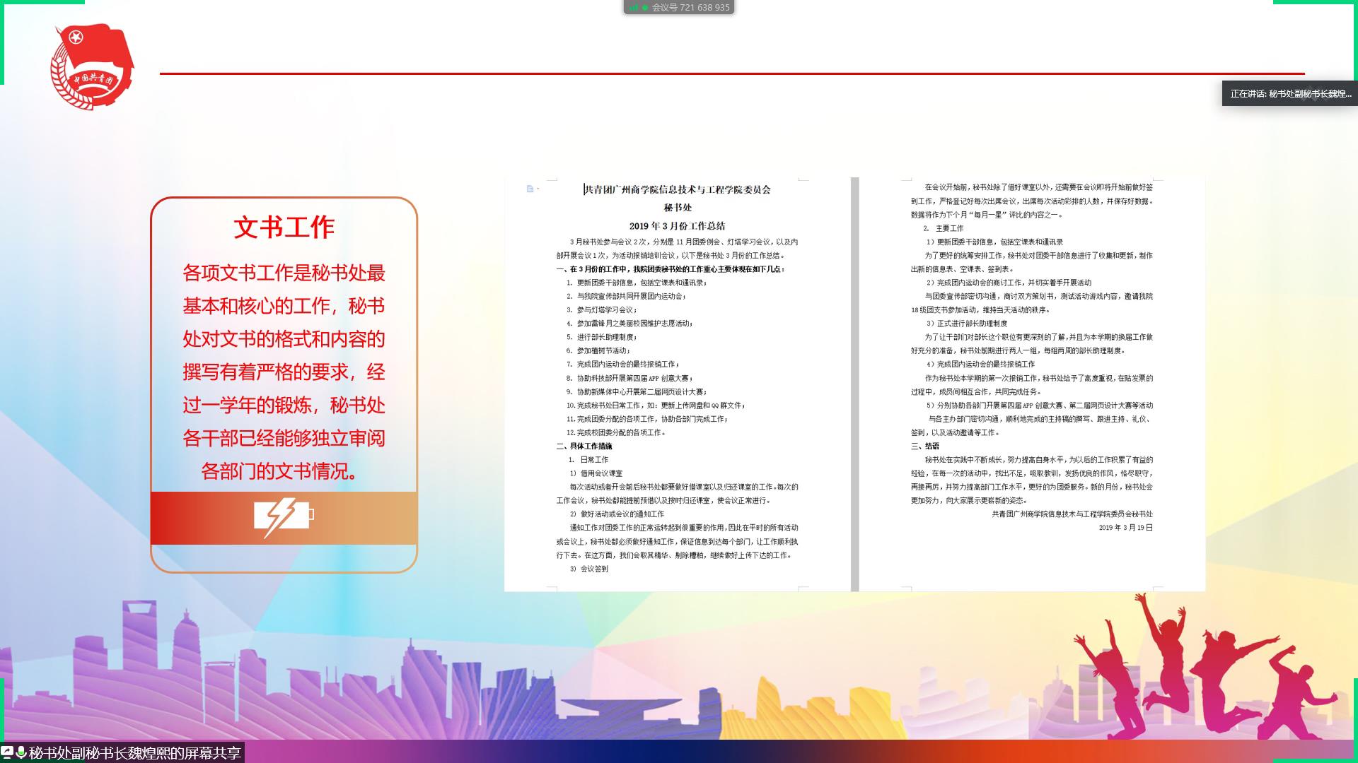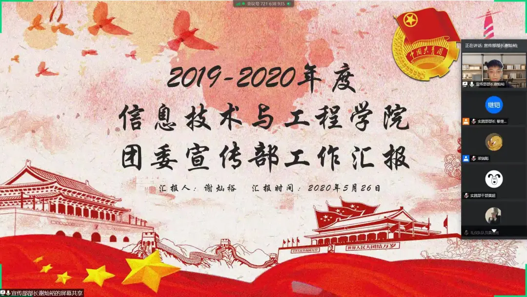 为了加强团委中部门与部门之间的交流,为了提升我院学生综合素质和技能。信息技术与工程学院于5月26日晚在腾讯会议线上举行了团委优秀部门评优会议。出席本次活动的嘉宾有团委书记兼17级辅导员郑开勋、团委副书记兼18级辅导员黄丹琪。