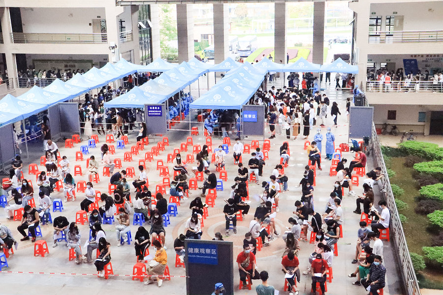 在疫苗接种现场中,相关部门工作人员和学校志愿者们积极开展相关志愿服务工作,并通过科学规划分区,保证接种全过程单向不反复。接种人员严格遵守防疫要求佩戴口罩,保持一米距离,在医护人员与志愿者的引导下有序排队。志愿者组成现场保障团队,对接种人员进行健康码身份信息核对、组织接种人员填写《知情同意书》,在各个区域做好秩序维护等预备工作。医护人员组成专业团队进行疫苗注射、提供医疗咨询等工作,在快速完成核酸疫苗注射的同时,也为师生的健康安全做了充足的准备,让师生打得安心、打得放心。保卫处、总务部后勤管理处和各学部院系协同配合,确保本次疫苗接种工作有序、安全、高效地开展。