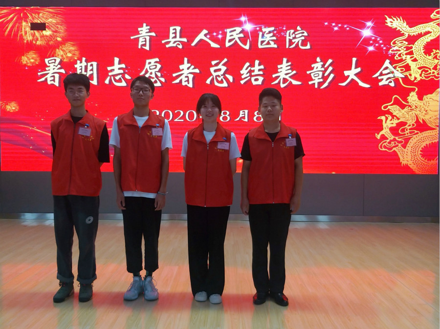 经过一个学期的网课学习,迎来了暑假,但疫情防控仍不可松懈,利用暑假的时间她再次主请缨,报名参与了河北省青县人民医院的暑期志愿者活动,继续为疫情防控贡献自己的一份力,协助完成医院疫情防控的宣传、门诊导引、征兵体检等工作。在此期间担任了志愿者团队的负责人,组织策划了10余场活动,包括:第二批志愿者上岗培训、暑期志愿者总结表彰大会、医疗知识学习、志愿活动等。在医院的这短短一个月,作为非医学生很荣幸有机会穿上白大褂,一开始自己有点兴奋,没想到自己还能有机会穿白大褂,当她跟带队老师去到门诊大厅门口的时候,有人直接走过来问路,而不是去问路边站着的其他人,那一瞬间她才明白身穿这身白大褂的责任感与使命感!在医院的日子让她收获了很多的感动,同时也体会到了作为医护人员的伟大。这短短一个月的时间,她,见到了医院支援武汉的5名英雄,听他们讲解抗疫的故事;见到了年过五十自己崴脚半个月不休息,怕耽误病人看病而一瘸一拐坚持上班的医生;见到了病人痊愈对着医生连连道谢时留下的激动的泪水…