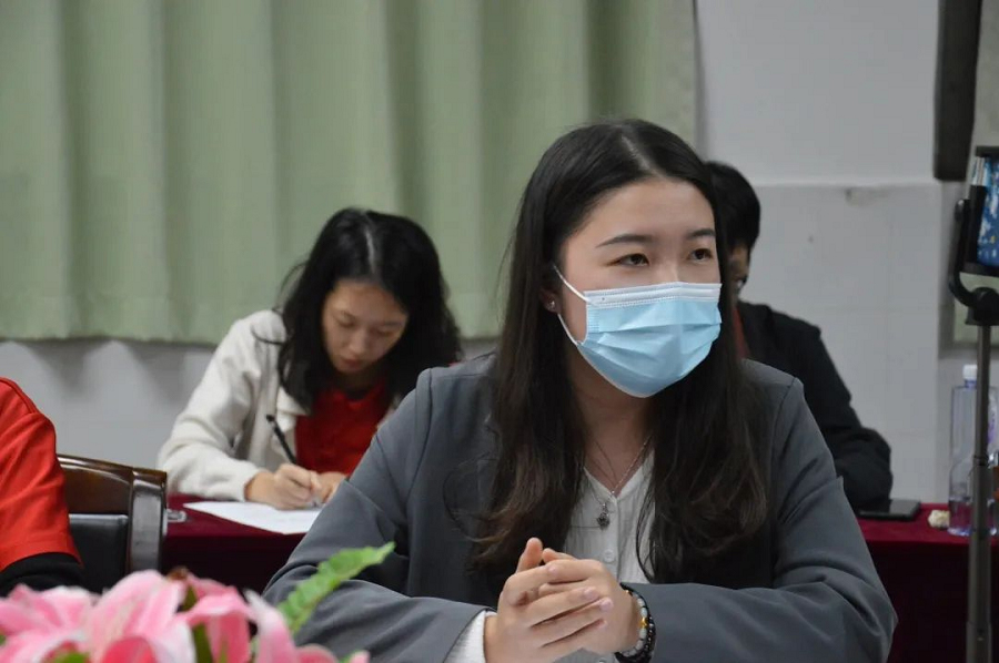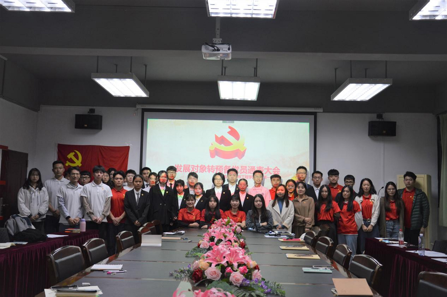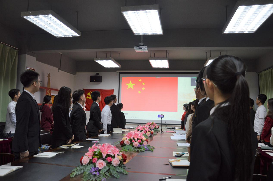 会议严格按照预备党员接收大会议程进行,第一项议程,与会成员全体庄重奏唱国歌。第二项议程由13名重点发展对象分别从个人情况、入党动机、自我规划等方面进行简要汇报。第三项议程由入党介绍人饶宏玉等4位党员同志分别从政治思想、学习成绩、干部经历等方面介绍发展对象的主要情况。第四项议程,由党支部组织委员吴雁敏同志向大会报告支委会对发展对象的审查情况,宣布13名重点发展对象的审查结果全体通过。第五项议程,在与会党员对发展对象是否符合党员条件发表意见进行不记名投票表决并由宣传委员林奕锐同志宣读支部大会的决议:同意13名重点发展对象转为中共预备党员。第六项议程,全体党员起立,高举右拳庄重宣读入党誓词。第七项议程,由党支部书记饶宏玉在党旗下为13名新的预备党员佩戴党员徽章,传递了党的责任和担当精神。第八项议程,由支部书记饶宏玉总结发言,她首先对13名新同志表示祝贺,并对他们给予了殷切期望。同时饶书记呼吁各位党员同志要加强学习,将学习成果内化于心,外化于行。