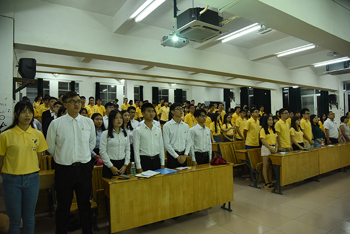 首先,全体起立奏唱国歌拉开了会议的序幕。随后,林俊杰书记上台发言,其肯定了这一年团委学生会的优秀表现,感谢干部们的辛苦付出,同时其提出了三点要求:一是干部要正确处理好学习和工作的关系;二是团委、学生会要团结一致,成为幸福e家人;三是干部应该以身作则,树立榜样,给其他学生做表率。