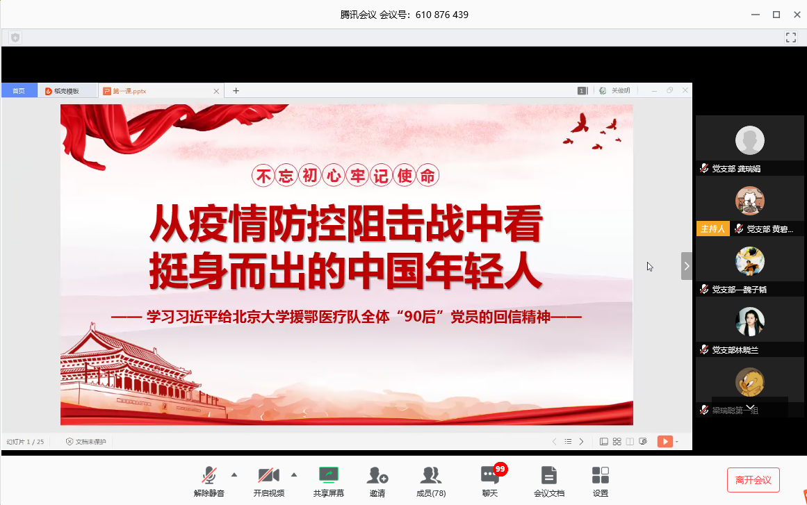 通过本次的党课培训,让大家进一步感受到习近平总书记对广大青年的殷切期望,了解到中国青年的抗疫故事。青年一代有理想、有本领、有担当,国家就有前途,民族就有希望。相信只要我们坚定信心,同舟共济,科学防治,精准施策,就一定能打赢这场疫情防控阻击战!