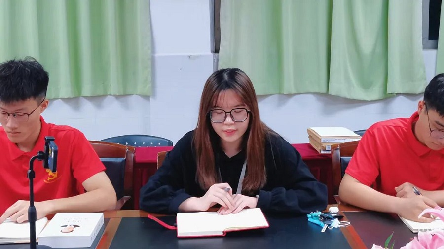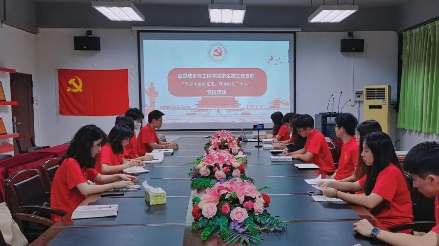 为迎接党的二十大胜利召开,深入学习贯彻习近平新时代中国特色社会主义思想。10月14日晚,信息技术与工程学院学生第三党支部在第六教学楼205会议室以线上线下相结合的方式开展“矢志不渝跟党走,青春献礼二十大”主题的党日活动。出席本次会议的有党支部书记朱国华同志,教师党员陈钰纯同志、胡舒娅同志以及全体学生党员。本次会议由蓝佳琪同志主持。