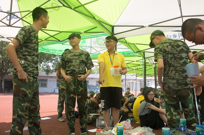 下午的足球场,太阳冷酷地灼烤着大地。新生们顶着烈日,以饱满的精神状态迎接下午的训练。学校还为新生们准备了凉茶,让他们在辛苦训练后喝上一杯清凉消暑的良药。过后,教官便组织新生进行军体拳训练和方阵训练,军体拳的队伍拳拳有力,斗志昂扬,打出了他们的风采,口号声喊出了他们的气势;方阵训练则是整齐无误,头上顶着的水瓶却丝毫不影响他们的训练,反而帮他们练就更加稳健整齐的队列,让人赞叹不已。