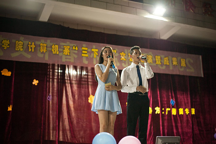 其后,服务队给桃源村村民带来了一场缤彩纷呈的视听盛宴。无论是像《仰望星空》或《一个像夏天一个像秋天》这样动人的歌曲,亦或是纪念反法西斯70周年的抗日小品,都赢得了在场村民小孩的赞扬。此外,各支教班纷纷带来了特色表演,如舞蹈班的孩子们与小老师伴随《青春修炼册》的旋律,扭动着身板带来朝气蓬勃的舞蹈;绘画班的小朋友以“小小绘画家“为主题,通过走秀向展示了这些天课堂学习的成果;地理班的小朋友则朗诵了《春夏秋冬》,稚嫩的声音在慢慢诉说着对桃源村浓浓的爱;“每个孩子,都应该被宠爱,他们是我们的未来,这是最好的未来”,音乐班孩子们的歌声如风铃般飘荡在桃源里,为桃源谱写了美妙的音符,也细细道出了支教班小老师们在授予孩子们知识时所坚守的信念。