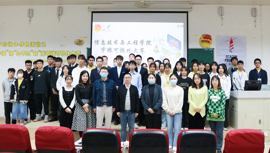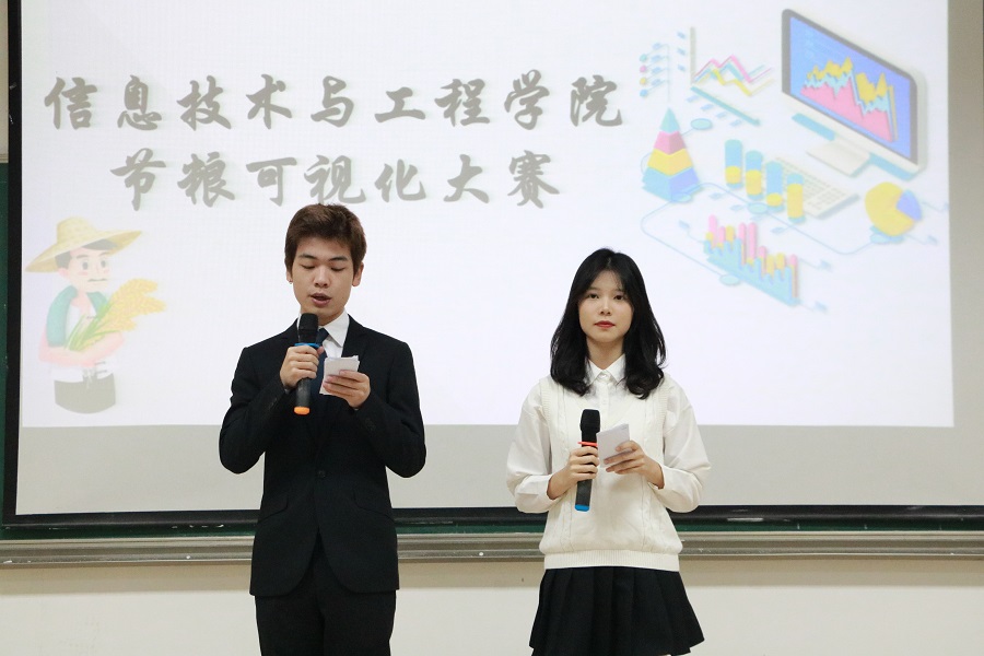 为积极响应习近平总书记关于“坚决制止餐饮浪费行为,切实培养节约习惯,在全社会营造浪费可耻、节约为荣的氛围”的重要指示,传承中华民族传统美德,发扬勤俭节约之风,推动广大师生养成健康良好的就餐习惯。信息技术与工程学院于11月30日晚在第四教学楼第二报告厅举办节粮可视化设计决赛,莅临本次比赛的嘉宾有信息技术与工程学院副院长何文海,广州商学院品牌宣传部廖秀娟,团委书记、20级辅导员陈钰纯和各级辅导员代表,华为ICT学院教师孔令熙。本次决赛由广州商学院校艺术团播音主持队罗梁坤、谭惠丹主持。