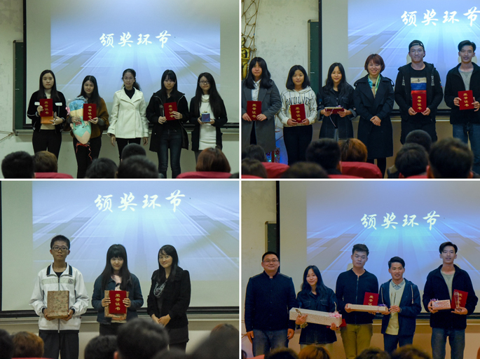 作品全部展示完后,周明华老师上台对所有作品逐一剖析,给出了比较专业的点评。周老师在点评中说到,本次的参赛作品都十分优秀,微电影的拍摄手法新颖,对于镜头切换、背景音乐和景别的运用都十分恰当;而电子海报作品的题材独特,色彩丰富而又和谐,明暗关系也能灵活处理,拥有不错的视觉效果。周老师还表示新媒体创作应该回归初心,注重视听上的享受,少用花俏的技巧,尽量做得生活化。最后,在激动人心的颁奖环节中,林俊杰书记等嘉宾为电子海报设计大赛和微电影创作大赛的获奖选手颁奖。颁奖的结束,也预示着此次的新媒体创作大赛落下帷幕。