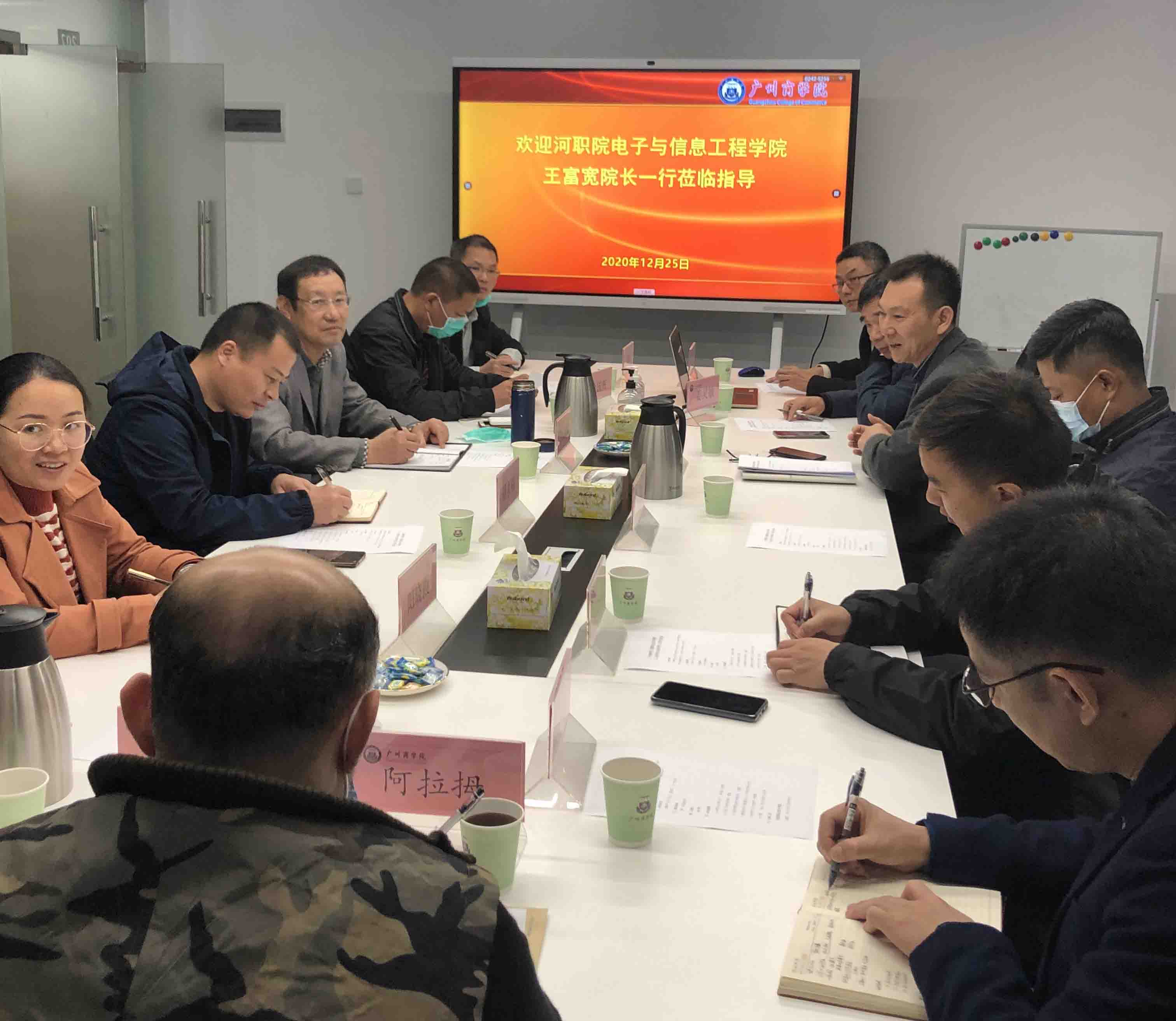 12月25日上午,为推进三二分段专升本协同育人项目,我校信息技术与工程学院与河源职业技术学院电子与信息工程学院召开协同育人研讨会。河源职业技术学院电子与信息工程学院院长王富宽、副书记徐国辉、副院长周永福、办公室主任曾庆宇,教研室主任阳晓霞等一行来访,我校副校长贾超,招生办主任栾璋宝,信息技术与工程学院院长姜灵敏,党总支书记关俊明,副院长吴广裕、李绍强,大数据技术学科带头人阿拉拇,督导方衡副教授,宁晓虹老师接待了王富宽一行。会议在第一行政楼207举行,由姜灵敏主持。