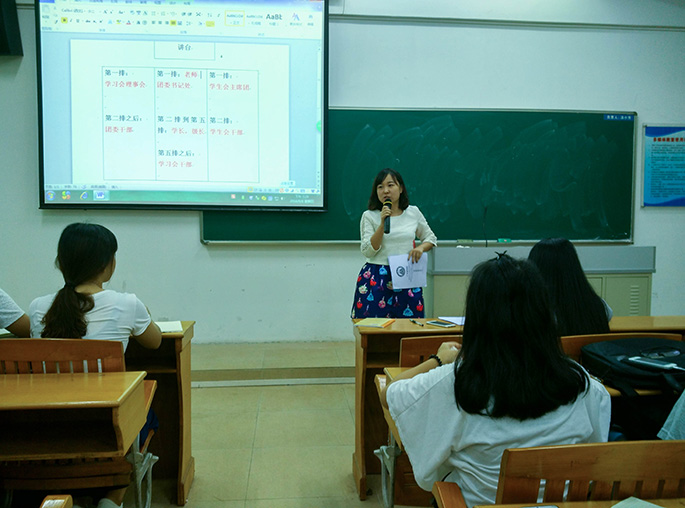 过后,16级辅导员陈素婷上台发表动员宣言,希望工作人员与学长们互相配合,以积极的态度对待这次迎新工作,帮助新生融入大学生活。其表示,已有学生前来学校报到,建议三大组织从现在开始就安排人员进行迎新,同时还强调了迎新当天报道的具体流程,重点强调对学生信息资料的保密工作。会议结束后,各小组负责人又召开小组会议,最后对9月10日当天迎新活动进行了总结强调,各工作人员也对此次迎新活动表明了信心。