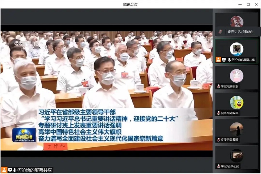 为深入学习习近平总书记在省部级专题研讨班上的重要讲话精神,凝聚同心共筑中国梦的磅礴力量,信息技术与工程学院学生第一党支部于8月27日在腾讯会议开展“喜迎二十大,永远跟党走”主题党日活动,参加本次会议的有党支部书记饶宏玉同志及全体学生党员,本次会议由何沁怡同志主持。