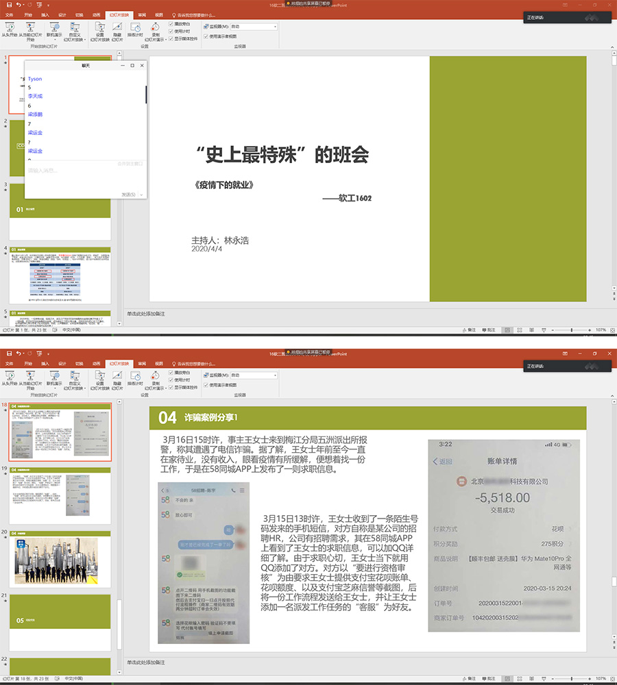 据统计,本次主题班会活动2016级班级参与率为100%,学生参与率为95.8%。各班班会首先强调了教育部、省教育厅和学校关于加强疫情防控的相关规定以及学生关心的疫情期间的相关热点问题,要求同学们服从当地政府和学校安排,遵规守纪,不信谣、不传谣,做有素质、有道德的文明大学生。各班开展主题班会的形式多样,内容丰富,各出新意,有以链接方式推送信息、以抽学号点名签到、以求职诈骗短剧播放、以在线实时问答方式分享经验等等,既有实用性,又达到教育意义。如软件1601班特别邀请了结对子李蓉老师及2名学长与同学们分享择业、就业、创业方面的经验,他们用自身的事例及所见为同学们积极寻找实习机会提供了动力;计科1601班班主任庄志蕾老师就同学们的能力差异及自信心不足作“更改就业角度,走出自己的路”主题分享,鼓励同学们结合自身的情况,寻找适合自己的就业方向完成就业,如选择有发展前景的小公司、考公务员、考研、应征入伍或者参加西部计划等;软工1602班以视频短剧《大学生求职之诈骗套路你中了么?》带领同学们认清求职诈骗套路,在诙谐轻松的氛围中引起警惕。辅导员陈素婷在各班会上进行交流总结,提醒同学们疫情期间重视自我防护,在努力完成毕业论文的同时积极借助广州商学院春季网络招聘会、“木棉花暖”大型公益网络招聘活动、“2020届高校毕业生全国网络联合招聘——24365校园招聘服务”活动等积极投递简历寻找更多春招机会,应聘时谨防收费陷阱、试用期陷阱、推荐信陷阱、“高薪”岗位陷阱等形式的招聘陷阱。