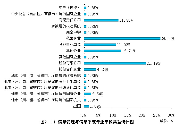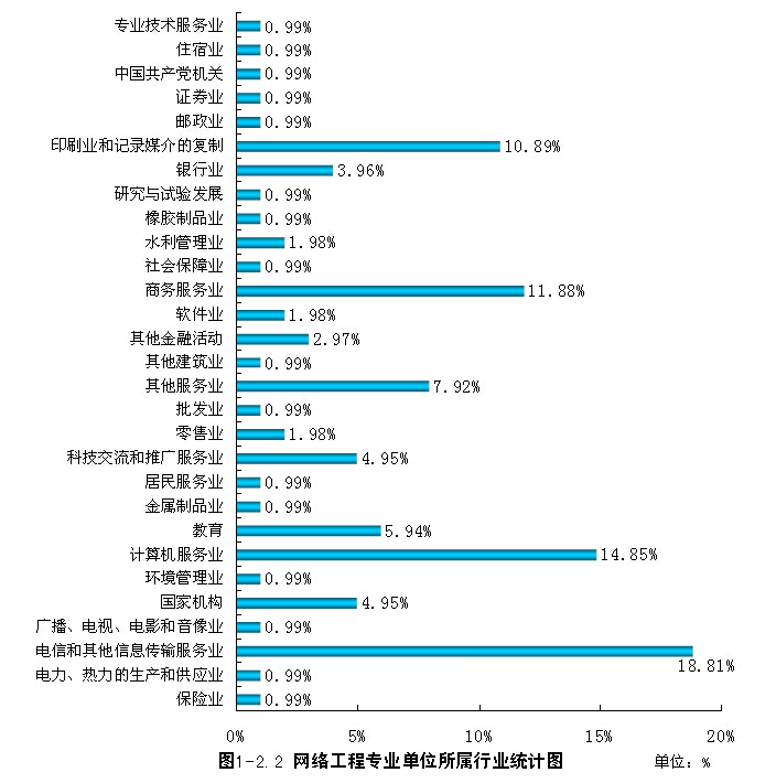 在所属行业中,电信和其他信息传输服务业19人占总就业人数的18.81%、计算机服务业15人占14.85%、商务服务业12人占11.88%,其中与计算机相关的行业电信和其他信息传输服务业、计算机服务业、软件业、专业技术服务业共37人,占总人数的36.63%。